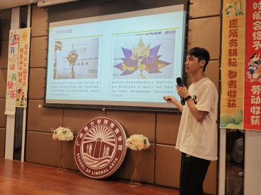 在学生分享环节,七个小组就创艺承物志、非遗的魅力、希望的田野、落叶成花、耕耘有回响、废物改造、纯纯的热爱展开了各自的案例与影像分享。